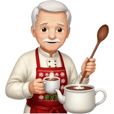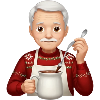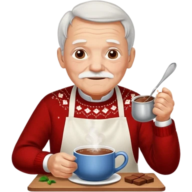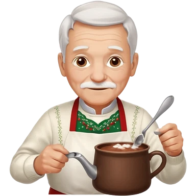 A gentle old man in a festive sweater and a white apron, stirring a pot of rich hot chocolate. emoji