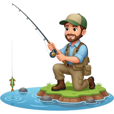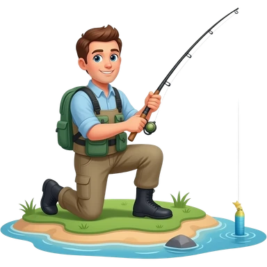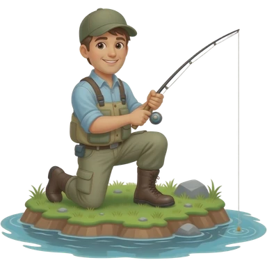 a guy fly fishing on his knees on an island into a river with a fly fishing rod emoji