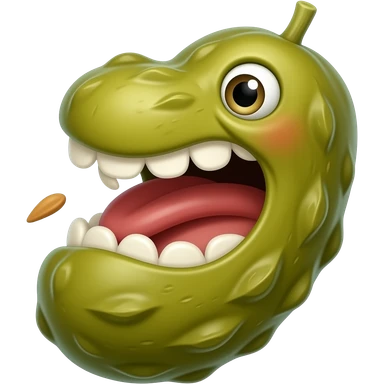 A brown misshapen pickle yelling "What the hell are chicken fried chicken for?" emoji
