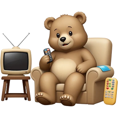 A cartoonish bear sitting comfortably, holding a remote control, watching a small TV with a happy expression, surrounded by cozy home elements, in a simple and clean emoji style. emoji