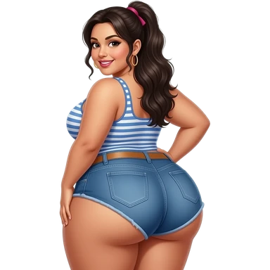 A fat big booty Latina showing her back thighs and buttocks with a beautiful smile while touching her buttocks emoji