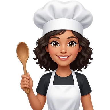 A light brown skinned woman with shoulder-length curly black hair dressed as a kitchen chef, holding a wooden spoon emoji