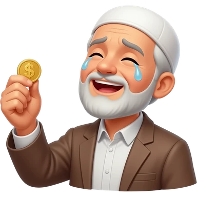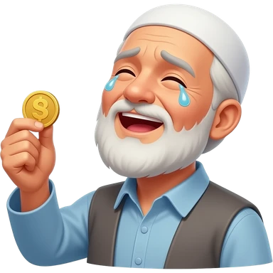 a poor elderly muslim man holding a gold coin, tears in his eyes, emotional happiness, looking up to sky with gratitude, warm glowing light on face, cinematic, ultra realistic, no text। emoji