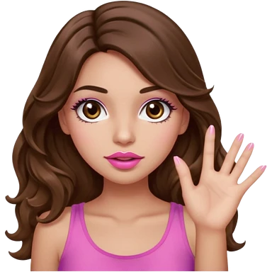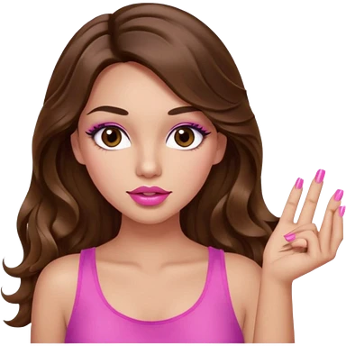 girl with long wavy brown hair, brown eyes, light to medium complexion, in a pink sexy top, pink lips, long lashes, puckered lips, what ever emoji