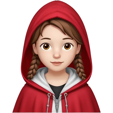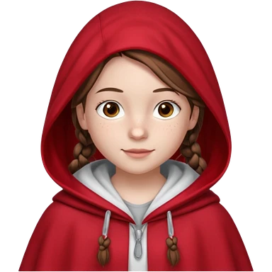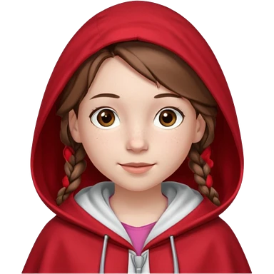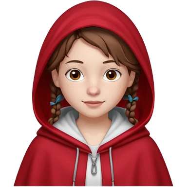 A 12-year-old girl, with fair skin, freckles, and a warming smile that shows her pale pink lips. She has big brown eyes and normal eyebrows. Her brown hair is styled in French braids that reach her breasts. She wears a bright red hooded cloak with the hood drawn over a pretty white tank top. emoji