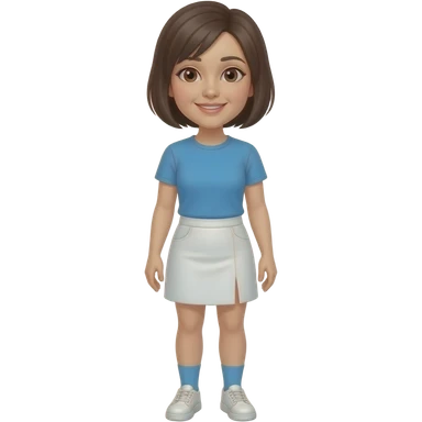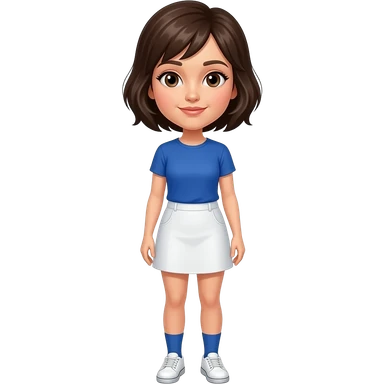 A woman with Brown eyes, Dark brown hair styled as a shoulder length Pixie cut, fair skinned and wearing a white skort, a royal blue T-shirt, sky blue socks and White shoes. emoji