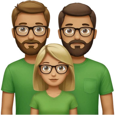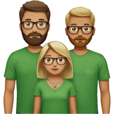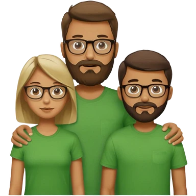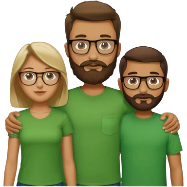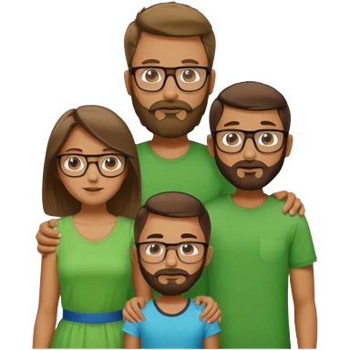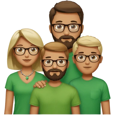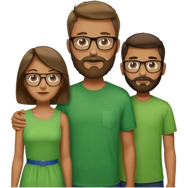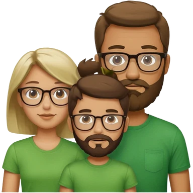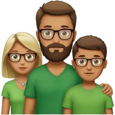 A family consisting of a man who's bearded, tanned, wearing glasses, a woman, slightly tanned, and a 14 year old teenage boy, slightly tanned, wearing a green t-shirt, not everyone is wearing glasses, emoji