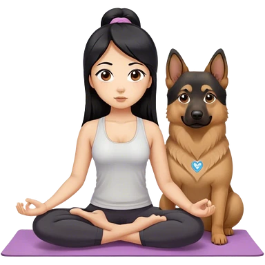 Asian, black hair and eyes, long straight hair, doing yoga, big eyes and nose, pretty, with a fat german shepherd emoji