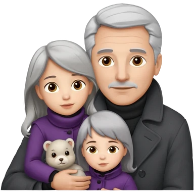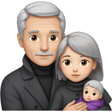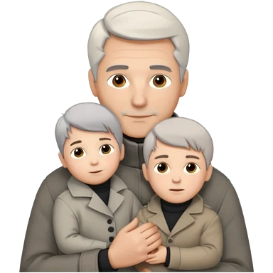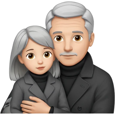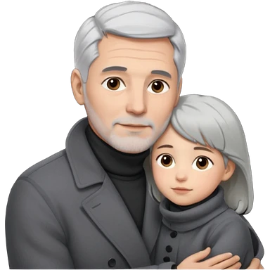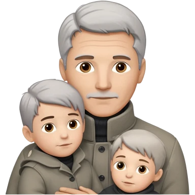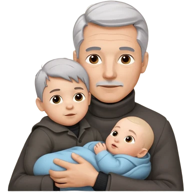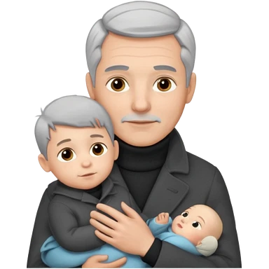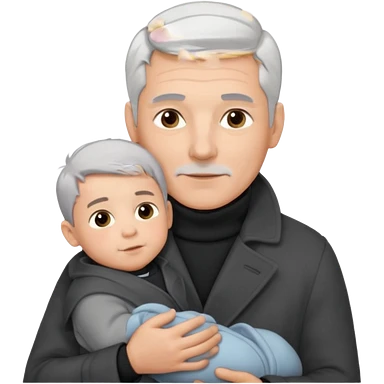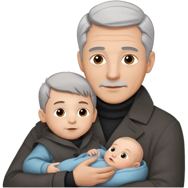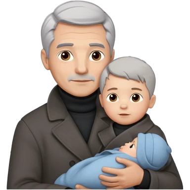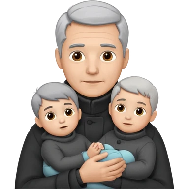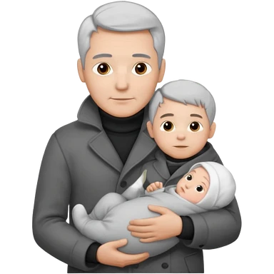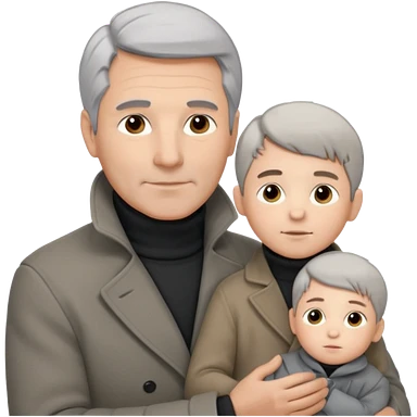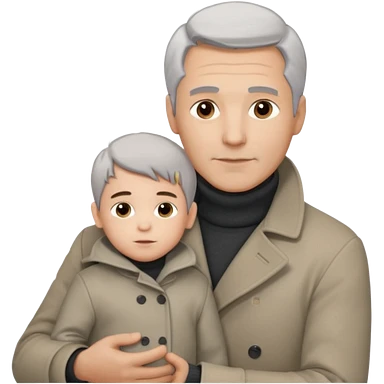 A father with messy medium-length dark hair and light stubble, wearing a green flannel shirt. He holds his one child who has short curly brown hair and a cream-colored romper. Cozy warm lighting, authentic family moment. emoji | AI Emoji Generator