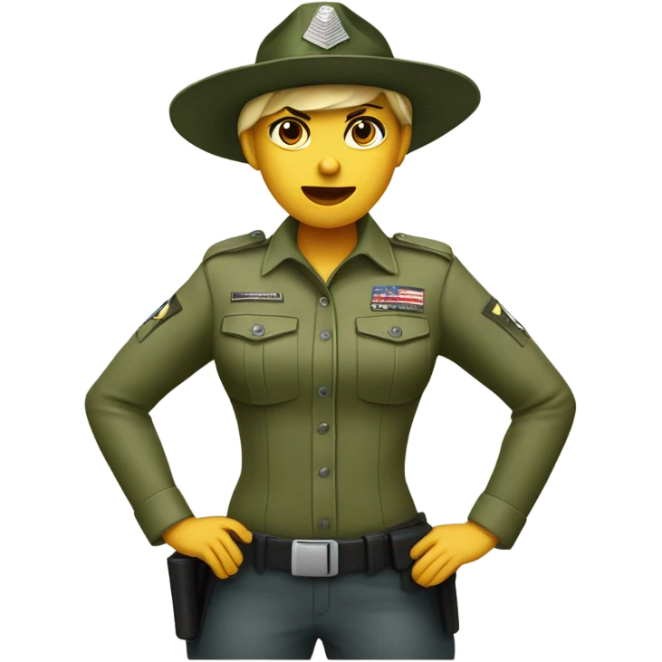 a female drill sergeant showing full torso wearing a classic sergeant hat and a camouflage army shirt. The character should have an angry intense expression. emoji | AI Emoji Generator