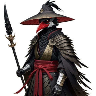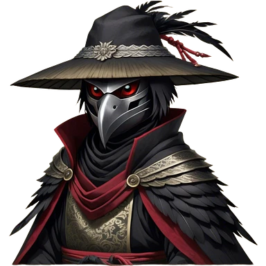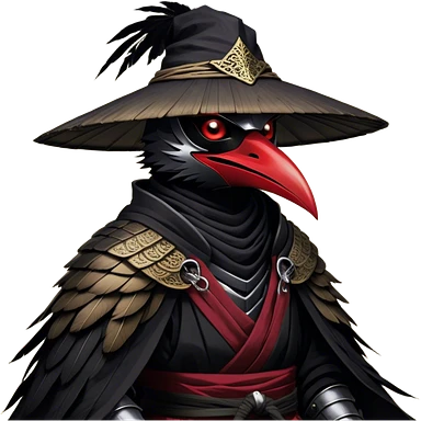 A fierce Kenku samurai with sleek black feathers, piercing crimson eyes glowing under the shadow of his straw hat. His sharp beak is partially covered by a black cloth mask, adding to his air of mystery. He wears layered black and crimson armor, intricate silver engravings etched into the metal plates. A long, tattered cloak billows behind him, worn from countless battles. His clawed hands grip the hilt of a curved katana, its polished blade reflecting the moonlight. Wisps of mist swirl around his taloned feet as he stands motionlessemoji
