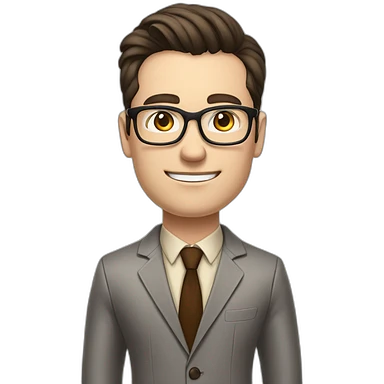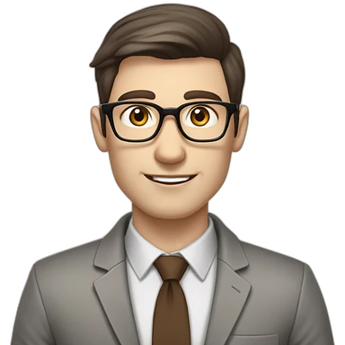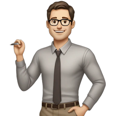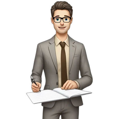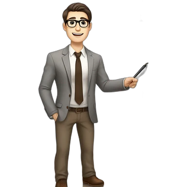 Pale skinned fit man with dark brown hair in gray jacket, beige office shirt, brown tie, brown pants and vintage glasses Writing text on a flipchart emoji
