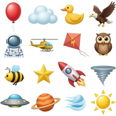 A is for Astronaut, balloon, cloud, duck, eagle, fly (verb), glider, helicopter, ice (cloud), jet, kite, lightning, moon, Neptune, owl, plane, queen bee, rocket, star, tornado, ufo, Venus, wind, x-rays, yellow (sun), and zigzag emoji