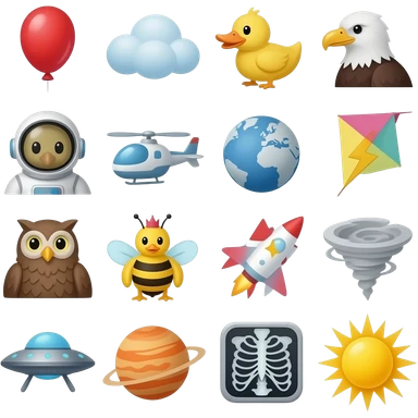 A is for Astronaut, balloon (hot air balloon), cloud, duck, eagle, fly (verb), glider, helicopter, ice (cloud), jet, kite, lightning, moon, Neptune, owl, plane, queen bee, rocket, star, tornado, ufo, Venus, wind, x-rays, yellow (sun), and zigzag emoji