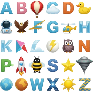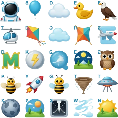 Air alphabet: a is for astronaut, balloon, cloud, duck, eagle, fly, glider, helicopter, ice, jet, kite, lightning, moon, Neptune, owl, plane, queen, rocket, star, tornado, ufo, Venus, wind, x-rays, yellow, zigzag emoji
