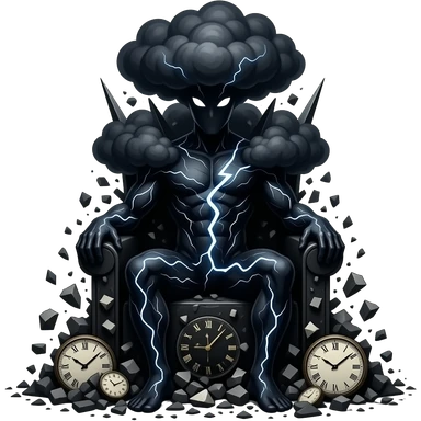 A dark godlike figure made of black lightning and storm clouds, eyes glowing white, sitting on a throne of broken clocks and crushed excuses, radiating absolute dominance, minimal flat icon style, dark background emoji