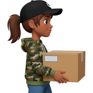 A tan skin girl with short hair tied back in a pony tail wearing a bblack aseball hat and a camo hoodie carrying a box emoji