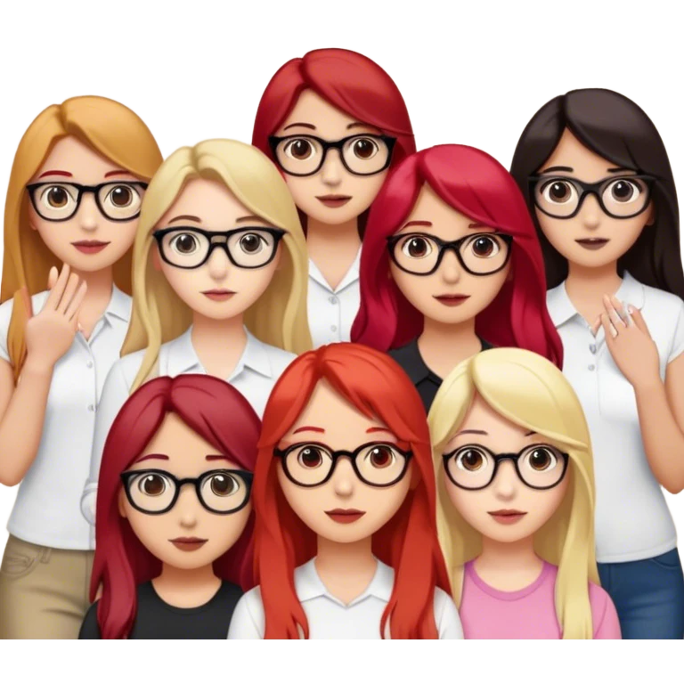 a friend group with 6 girls. one is blonde with glasses and a light skin, one is thailand and has long red hair and glases, the other one is turkish and has glasses on and dark hair, the other is german with dark long hair and dark eyes, the other one has middle length brown hair beautiful brown eyes and brown eyebrows and beautiful long lashes, and the other is blonde and shy emoji