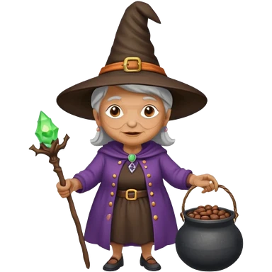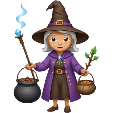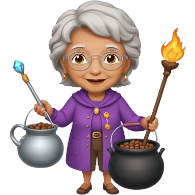 A grandma walking with a magic wand and a cauldron while holding a can of beans emoji
