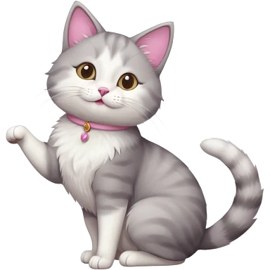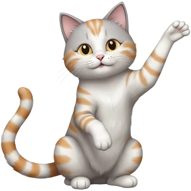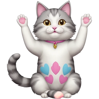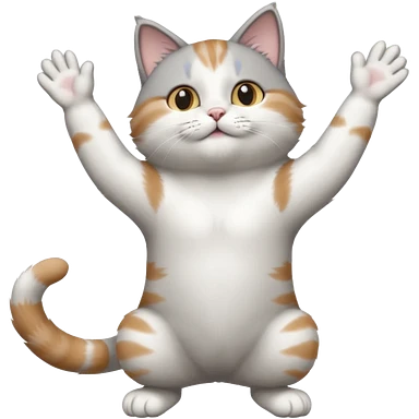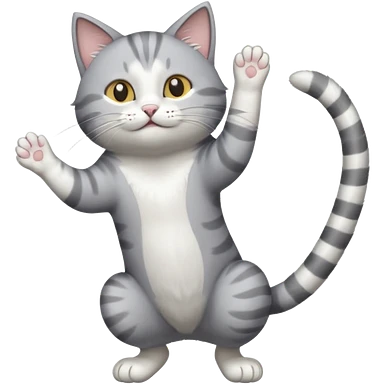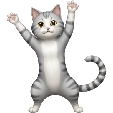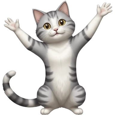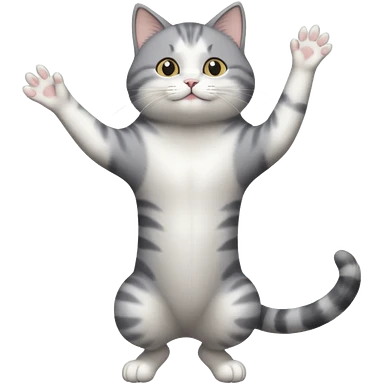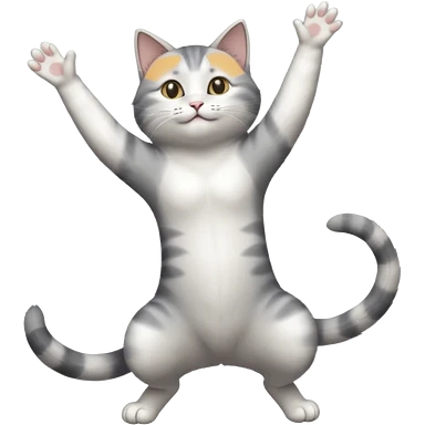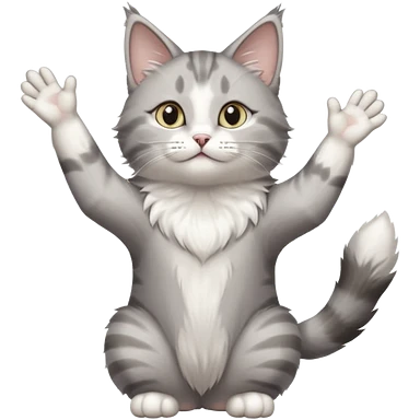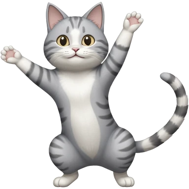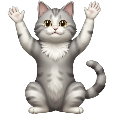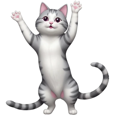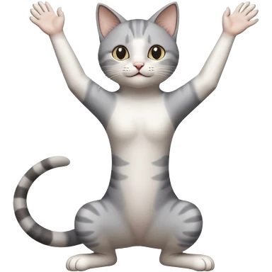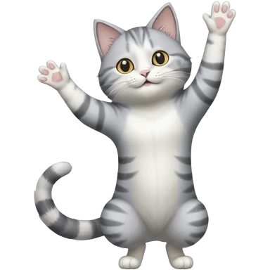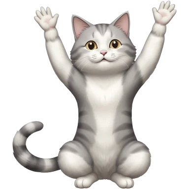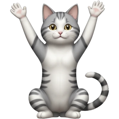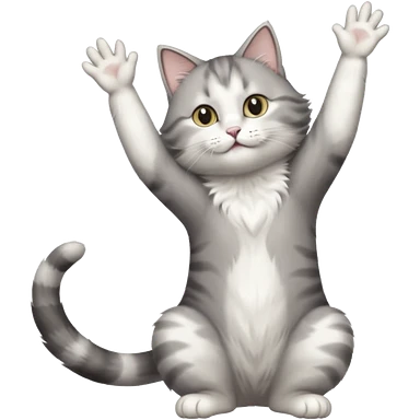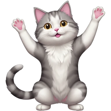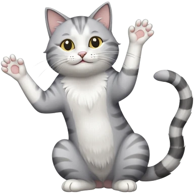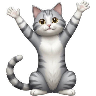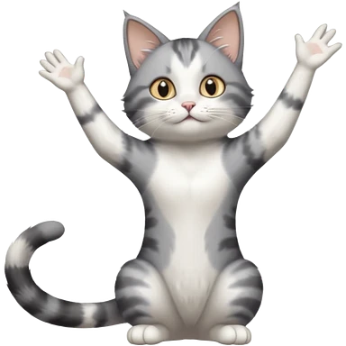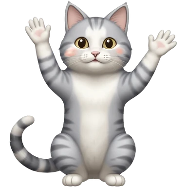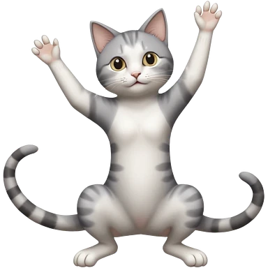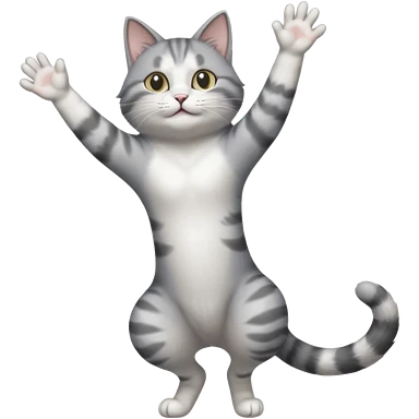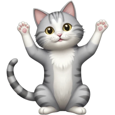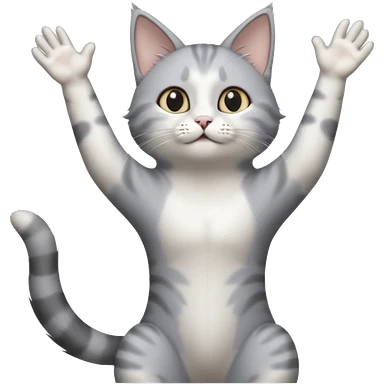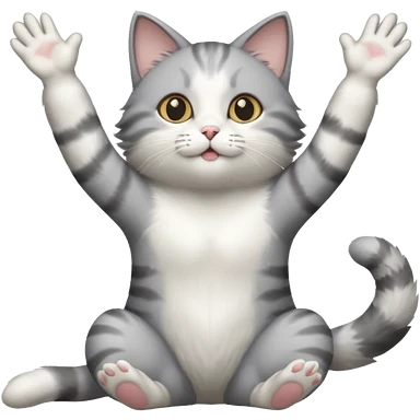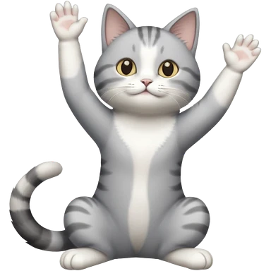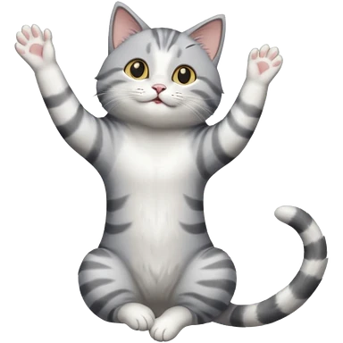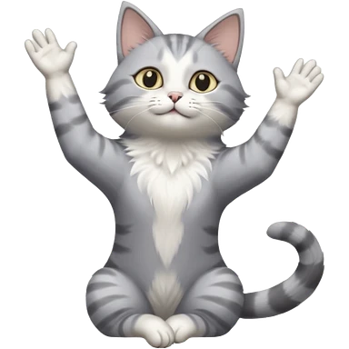 grey and white cat doing a big long stretch reaching up into the airwith arms together emoji