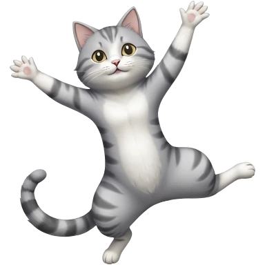 grey and white cat doing a big long stretch reaching up into the air with arms and legs together emoji