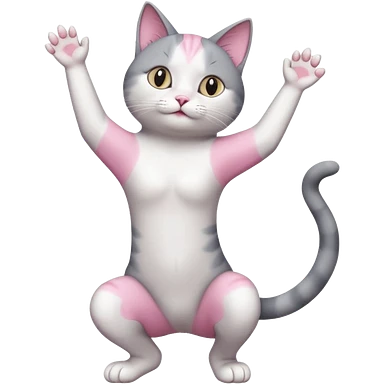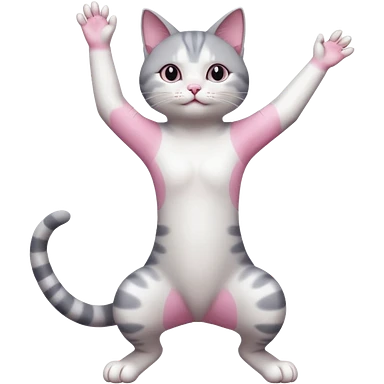 grey and white cat doing a big long stretch reaching up into the air with arms and legs side by side together emoji