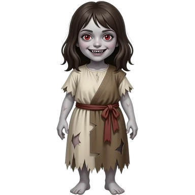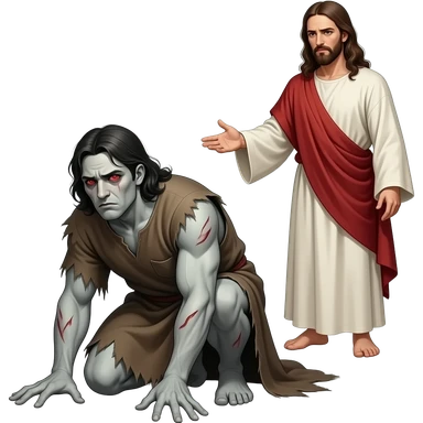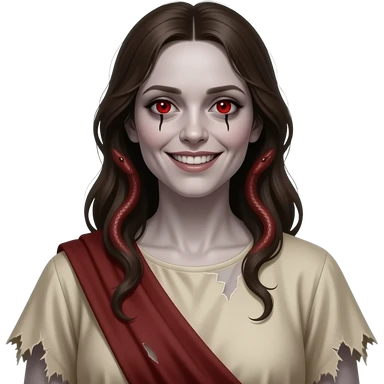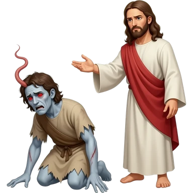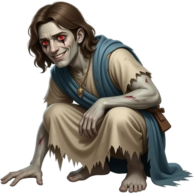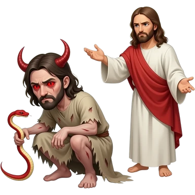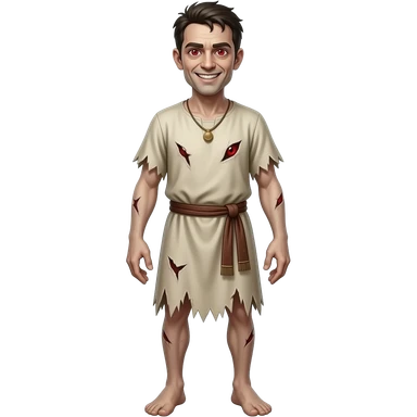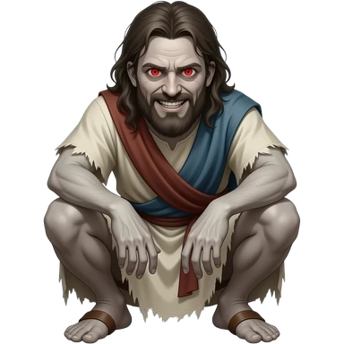 A full bodied emaciated old man with ashen colored skin, yellow serpent eyes with slim black slits for pupils and possessed by an evil spirit man that has an angry smile on his face, wearing tattered clothing from biblical times emoji | AI Emoji Generator