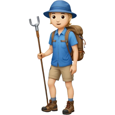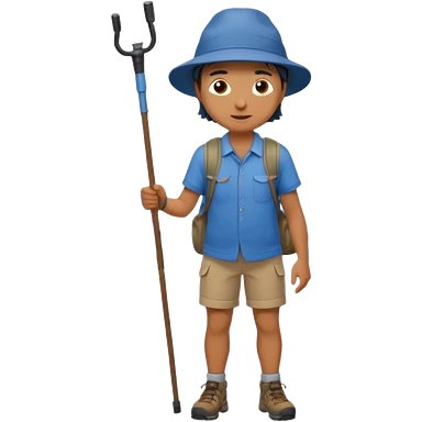 a full-body hiker with a hat blue shirt and hiking stick.hiking a mountain emoji | AI Emoji Generator