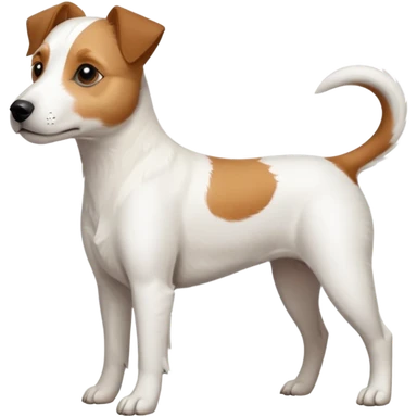a full body slightly chubby white parson russell terrier looking dog the size of a kelpie with light brown long ears and a light brown patch on one eye and a large snout. the rest of the dog is completely white. forward facing emoji