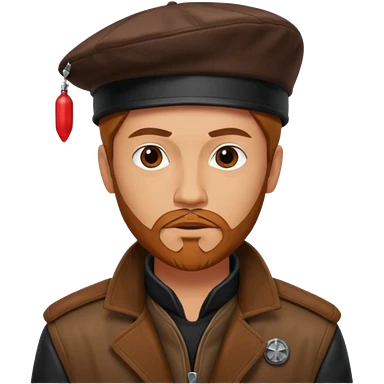 A tall guy with a red goatee. He wears a black baret dressed like a star wars smuggler emoji