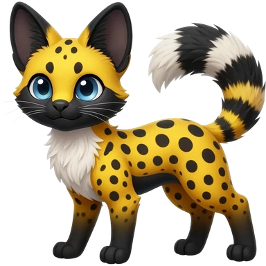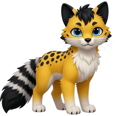 beautiful elegant spotted hype-realistic, black-maned, vibrant yellow Genet-Serval-Sergal-Margay-Fox-fusion-hybrid-furry-fursona, full body, with a long puffy fluffy black-and-white-striped tail, with natural blue eyes emoji