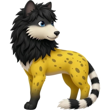cool beautiful elegant spotted hype-realistic, black-maned, vibrant yellow Genet-Serval-Sergal-Margay-Fox-Wolf-fusion-hybrid-furry-fursona, black scruffy mane on back, long muzzle snout, full body, with a long puffy fluffy black-and-white-striped tail, black long big ears, with natural blue eyes emoji