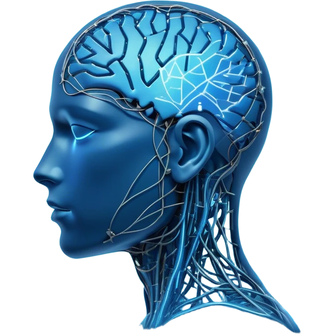 A futuristic and sleek AI-themed emoji. A glowing blue human head silhouette with a transparent effect, filled with interconnected circuit lines and neural nodes, symbolizing artificial intelligence. The head has a smooth, minimalistic design with a subtle glow around it. One side of the head blends into a digital pixelated pattern, showing the transition between human and machine intelligence. A small floating holographic brain or chip icon hovers near the head, reinforcing the AI theme. The background is dark or gradient blue to enhance the high-tech feel emoji | AI Emoji Generator