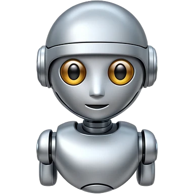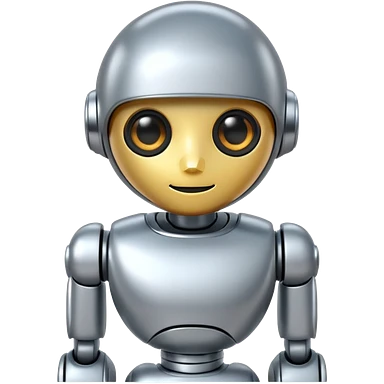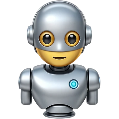 A cute futuristic robot emoji made of silver chrome, rounded friendly body, minimal facial features, glossy metallic surface, soft reflections, iOS emoji style, centered, clean white background emoji