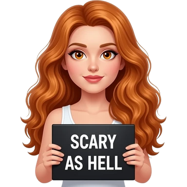 sexy girl with long wavy ginger hair and ginger eyes wearing a white tanktop is holding a black colored sign with SCARY AS HELL written on it emoji