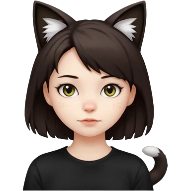 a girl with pale skin, short dark brown hair with lots of dandruff , cat ears and a tail, with a black t-shirt on emoji