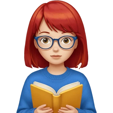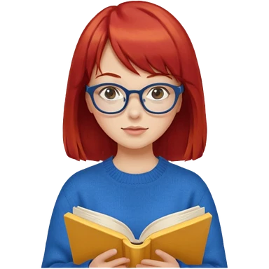 a girl with long red hair and bangs with glasses wearing blue sweater reading a yellow cover book emoji
