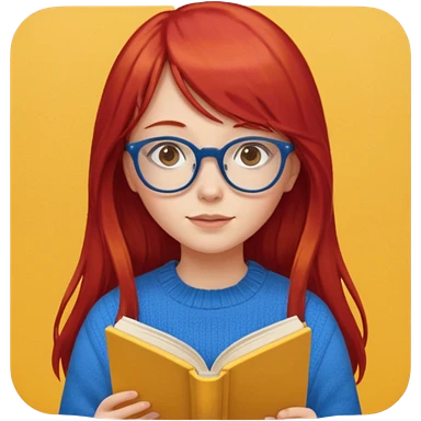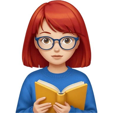 a girl with red hair and bangs with glasses wearing blue sweater reading a yellow cover book emoji