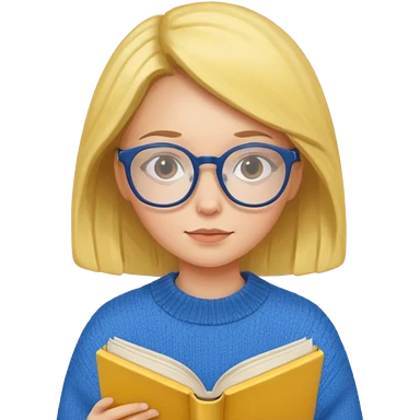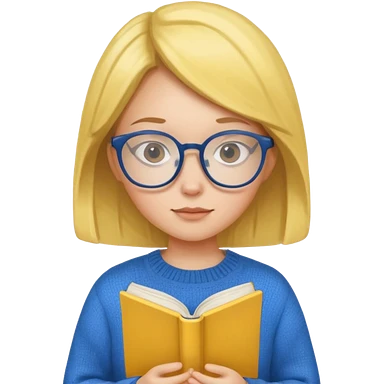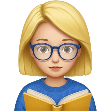 a girl with glasses wearing blue sweater reading a yellow cover book emoji