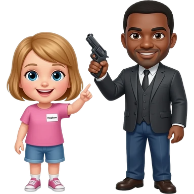 A girl with a name tag that reads “Reaghann” being pointed at by a black man with a gun emoji