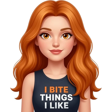 sexy girl with overlong ginger hair and ginger eyes a top with I BITE THINGS I LIKE written on it emoji