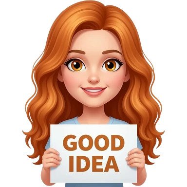 sexy girl with long wavy ginger hair and ginger eyes is holding a sign with GOOD IDEA written on it emoji