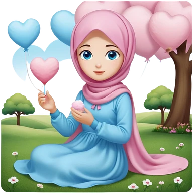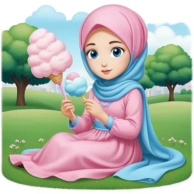 Turkish beautiful finish Konya girl blue eyes with cotton candy hijab long tail dress and sits on the grass on the ground and hold cotton candy on hand emoji