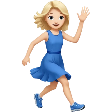 A girl in a blue dress runs and waves hello emoji