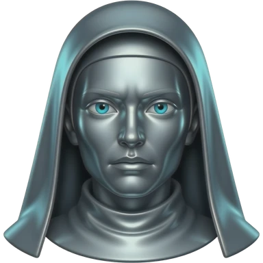 "A polished chrome monk woman statue head, front-facing, serious focused expression, glowing cyan (#00D4B1) eyes, dark background. Metallic reflections with subtle cyan light accents. Clean, no background, emoji style, high detail. The statue represents discipline, focus and self-mastery." emoji