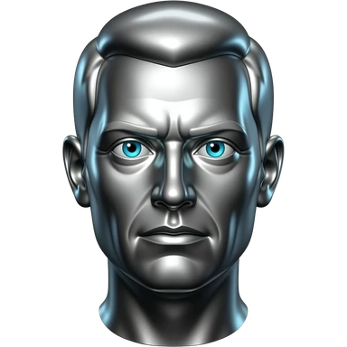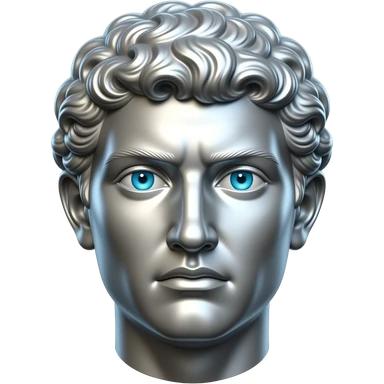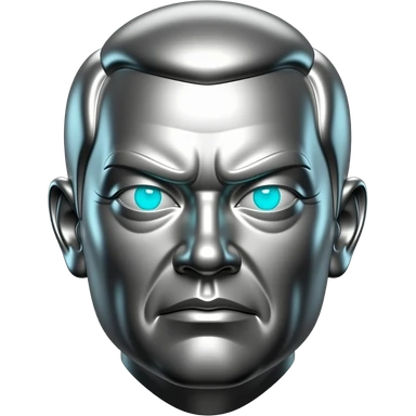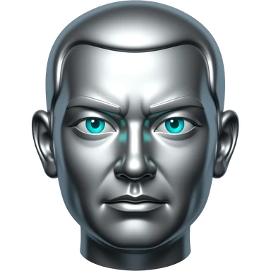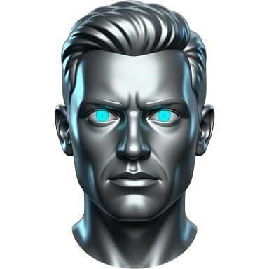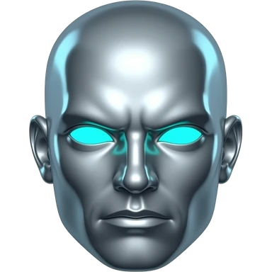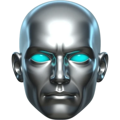 "A polished chrome german men statue head, front-facing, serious focused expression, glowing cyan (#00D4B1) eyes, dark background. Metallic reflections with subtle cyan light accents. Clean, no background, emoji style, high detail. The statue represents discipline, focus and self-mastery." emoji