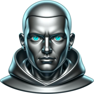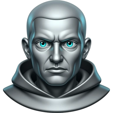 "A polished chrome monk statue head, front-facing, serious focused expression, glowing cyan (#00D4B1) eyes, dark background. Metallic reflections with subtle cyan light accents. Clean, no background, emoji style, high detail. The statue represents discipline, focus and self-mastery." emoji
