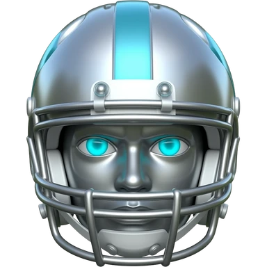 "A polished chrome american football statue head, front-facing, serious focused expression, glowing cyan (#00D4B1) eyes, dark background. Metallic reflections with subtle cyan light accents. Clean, no background, emoji style, high detail. The statue represents discipline, focus and self-mastery." emoji