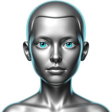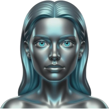 "A polished chrome german woman statue head, front-facing, serious focused expression, glowing cyan (#00D4B1) eyes, dark background. Metallic reflections with subtle cyan light accents. Clean, no background, emoji style, high detail. The statue represents discipline, focus and self-mastery." emoji