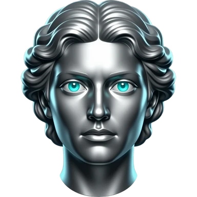 "A polished chrome greek woman statue head, front-facing, serious focused expression, glowing cyan (#00D4B1) eyes, dark background. Metallic reflections with subtle cyan light accents. Clean, no background, emoji style, high detail. The statue represents discipline, focus and self-mastery." emoji
